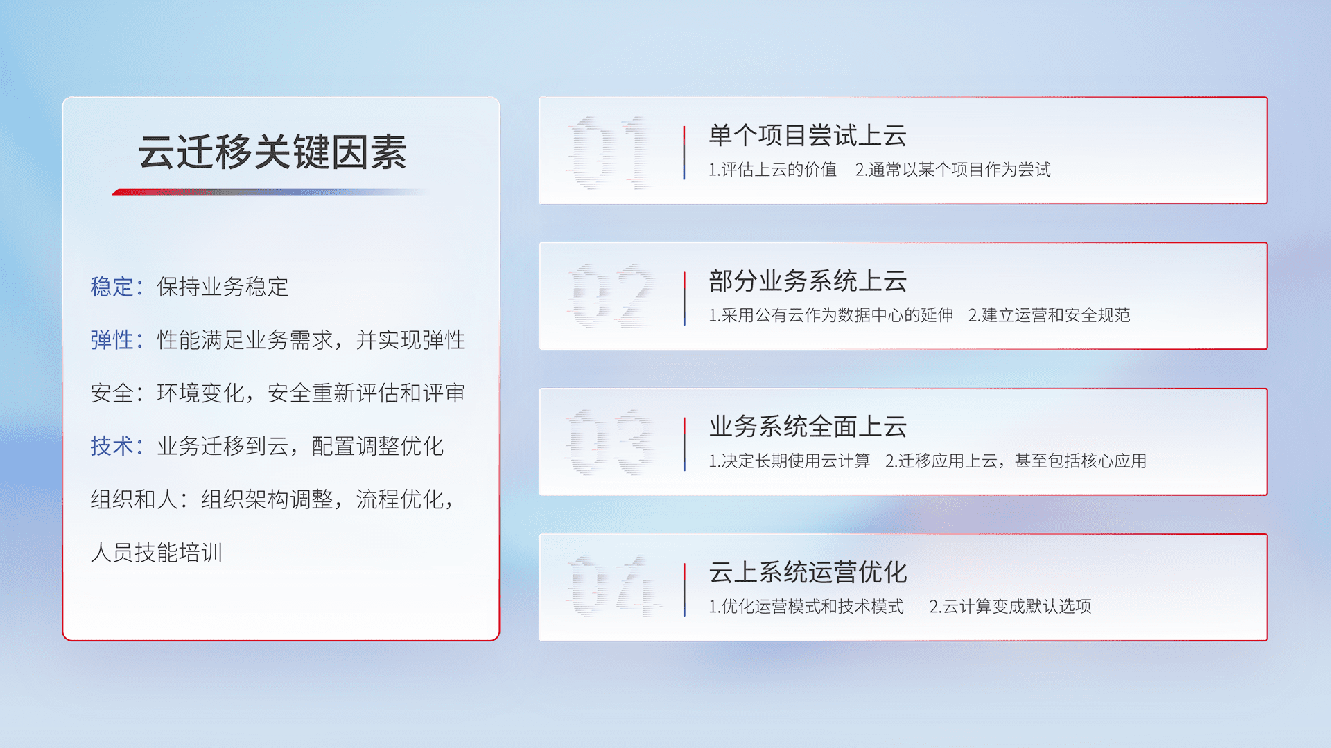 结合实际业务,,,从规划设计、、、、云平台选型、、、云原生改造、、数据迁移、、、集成交付,,迁移全过程为客户识别最佳上云路径,,,做好风险识别管理,,设计网络架构、、、、身份权限、、安全审计合规、、、、操作审计、、、日志审计、、监控告警策略、、、多站点容灾设计等,,,,对云上基础设施进行整体规划,,提升IT治理水平,,以满足弹性、、、、高可用、、高性能的需求。。。