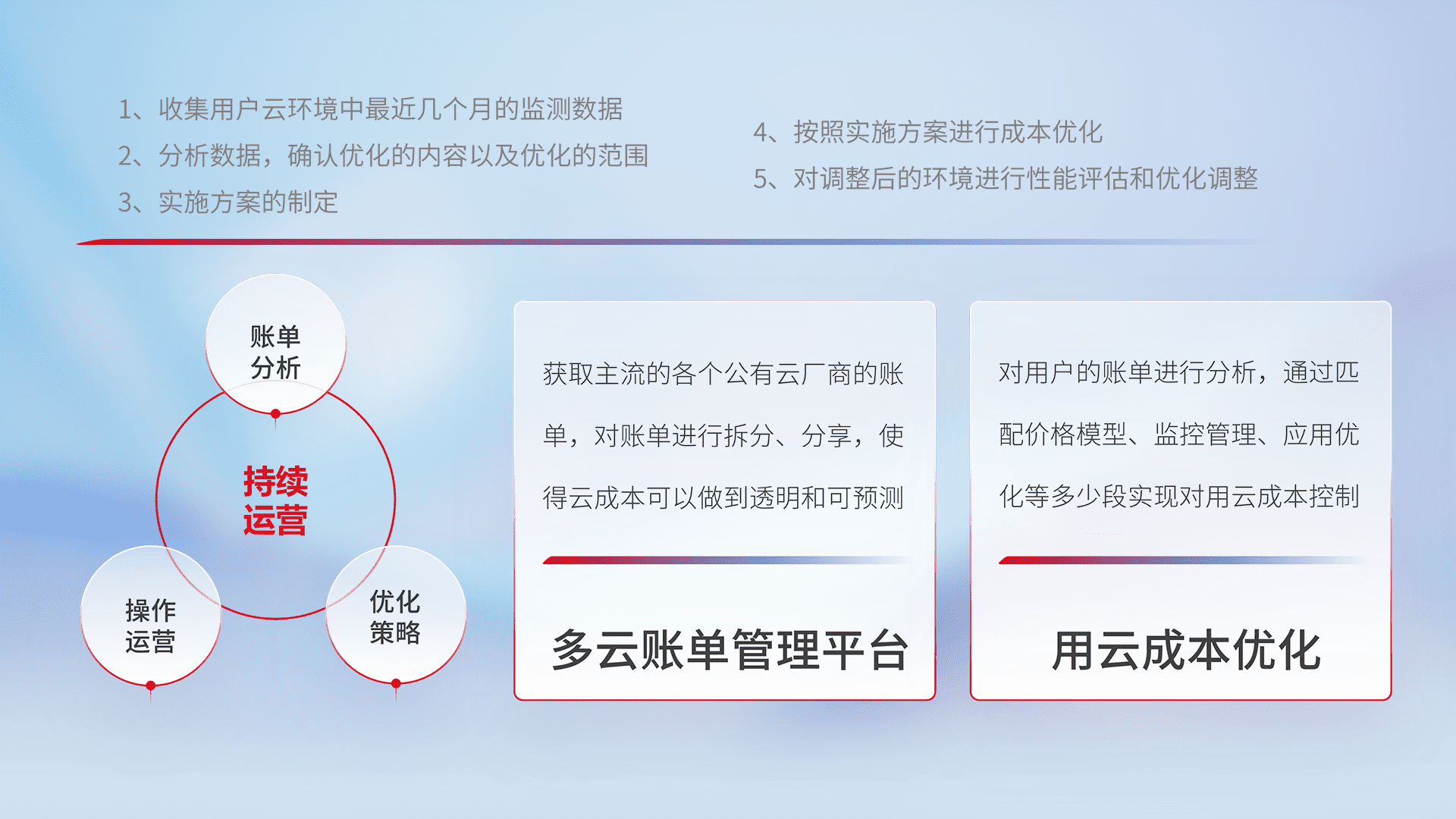 通过多云纳管,,,以统一的资源数据模型把客户的云资源进行抽象和封装,,,进而实现对多云资源的统一操作,,,,保障云资源管理的可靠性、、、稳定性与可用性。。。。量身定制化运维内容,,,,配置、、开发运维、、、补丁管理、、、备份、、、监控、、认证和访问管理、、、、审计和日常巡检等,,保障在用云过程中的可靠度,,,,稳定度以及高可用率。。