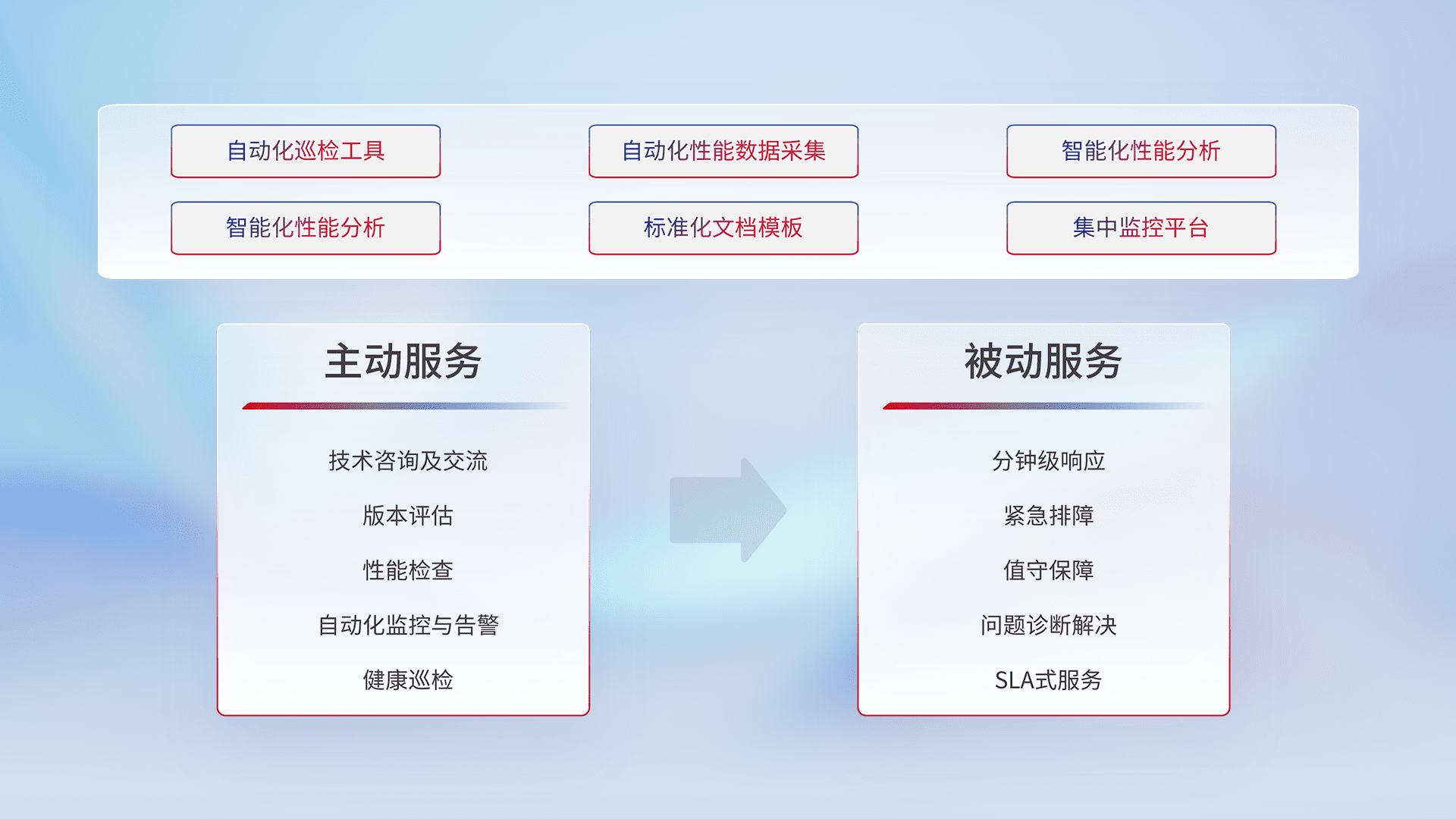 智能化工具和标准化文档,,,,保障服务质量,,提供主动服务(包含技术咨询、、、、版本评估、、性能检查、、、、自动化监控与告警、、、健康巡检)和被动服务包含(分钟级响应、、紧急排障、、、值守保障、、问题诊断解决、、、SLA服务)。。